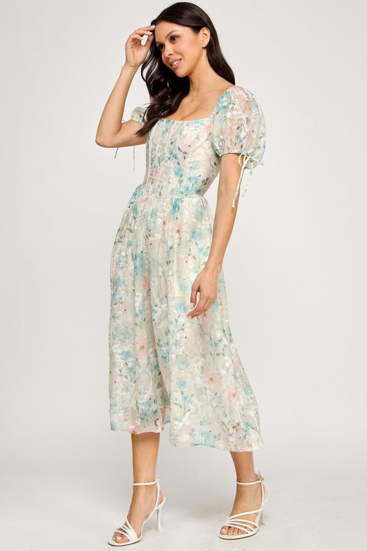 Floral Puff Sleeve Midi Dress With Smocked Back
