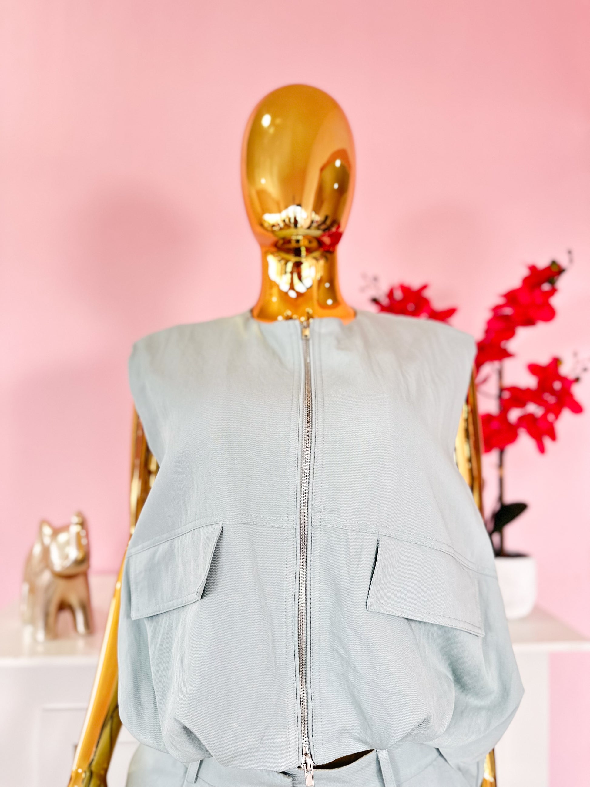 Palabras clave para SEO: chaleco menta mujer, chaleco casual verano, chaleco con cierre y bolsillos, ropa fresca para mujer, outfit pastel mujer.