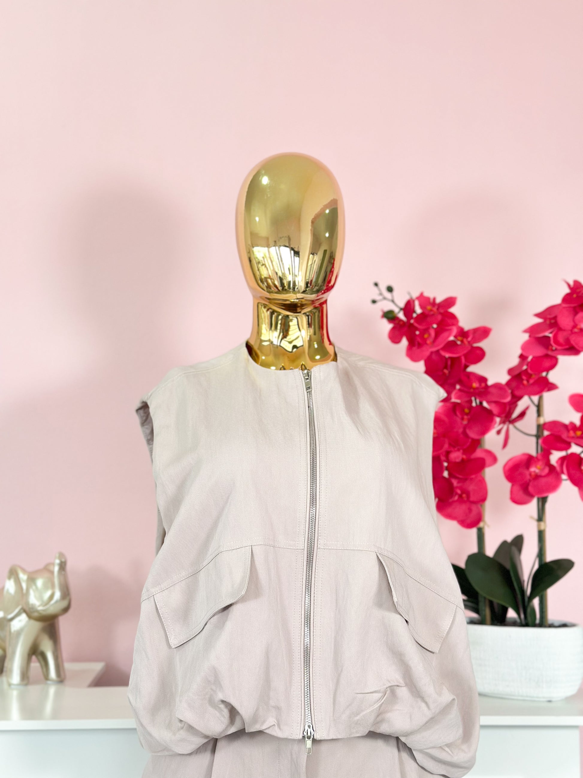 Palabras clave para SEO: chaleco nude mujer, chaleco casual elegante, ropa minimalista mujer, chaleco con cierre y bolsillos, outfit neutro verano.