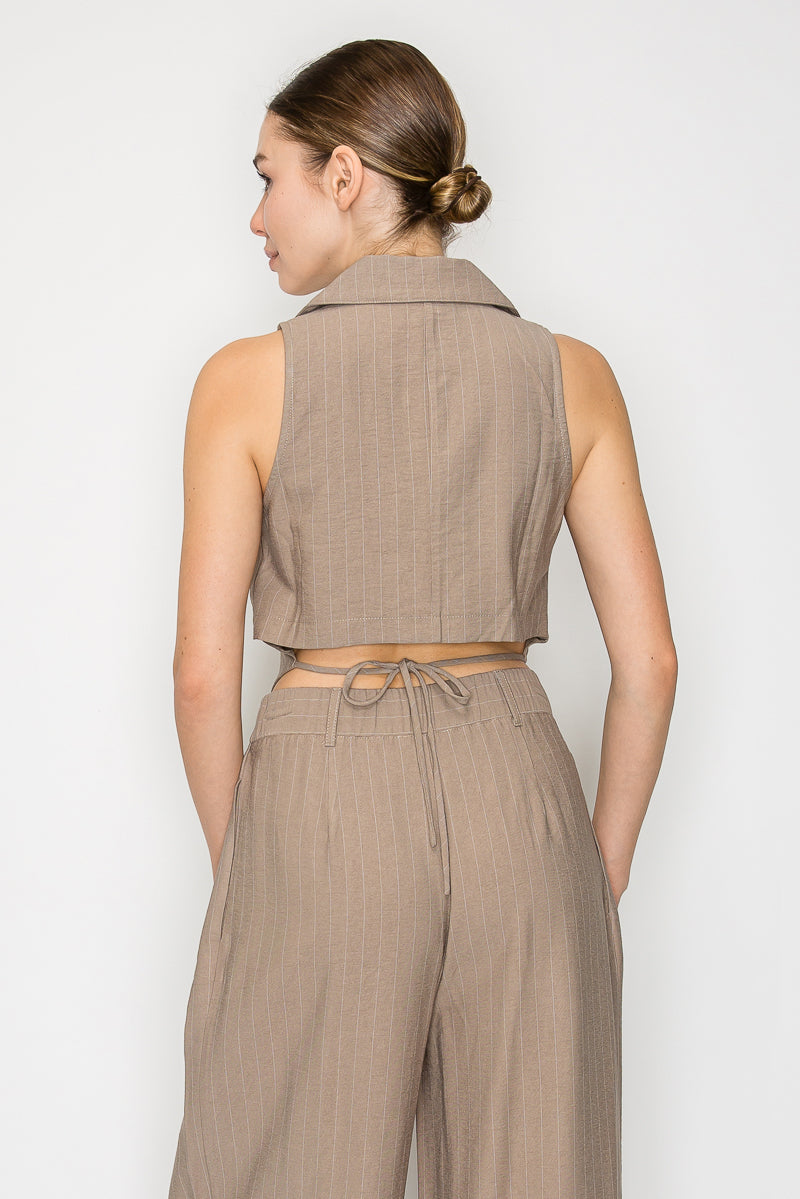 Top corto de estilo urbano y contemporáneo, confeccionado en un tejido suave, ligero y transpirable con un elegante patrón de rayas. Presenta escote en V con cuello de solapa y diseño sin mangas para un look fresco. Su dobladillo asimétrico aporta un toque moderno, mientras que el lazo en la espalda añade un detalle femenino y sofisticado.