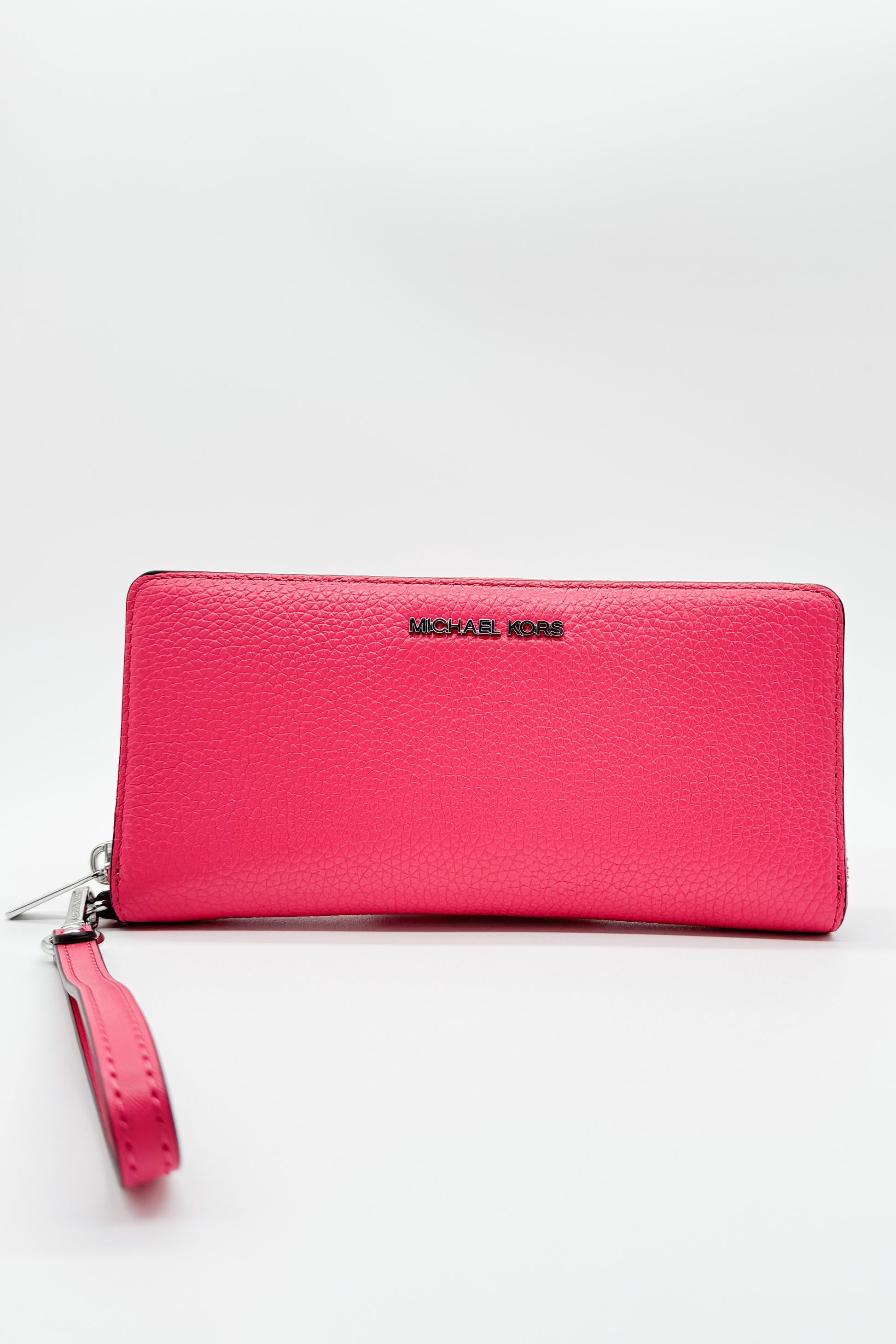La imagen presenta un hermoso y sofisticado monedero de la reconocida marca Michael Kors, en un vibrante color rosa intenso. Su diseño elegante y minimalista lo convierte en un accesorio ideal tanto para ocasiones especiales como para el uso diario.