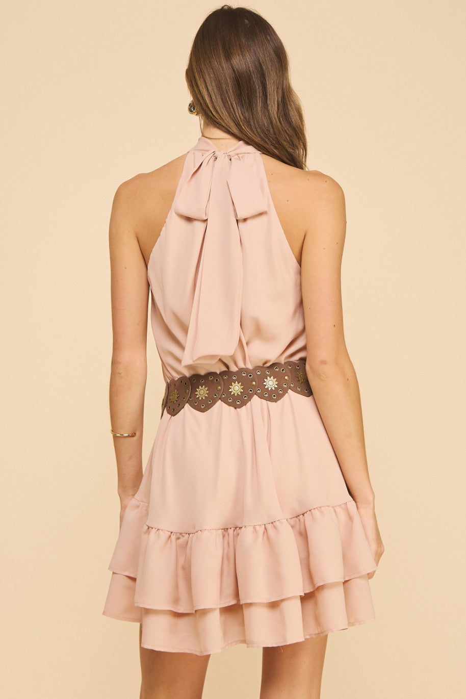 Vestido elegante y ligero confeccionado en tejido Wool Dobby 100% poliéster, fabricado en Estados Unidos con acabados de alta calidad. Presenta un escote halter ajustable con lazo en la espalda que realza la silueta y aporta un toque sofisticado.