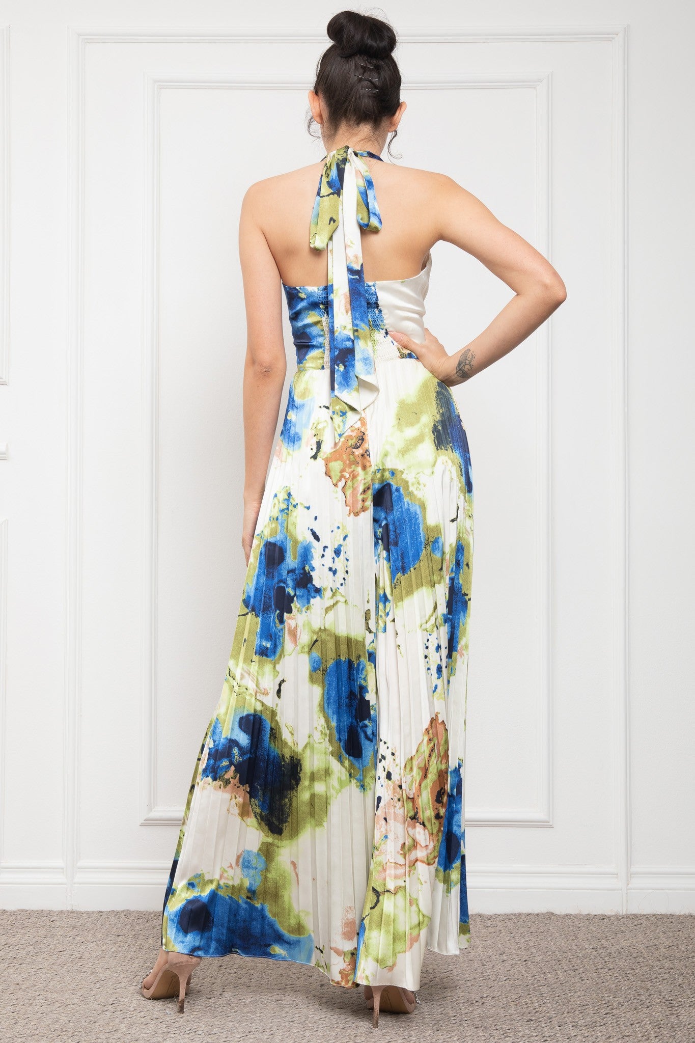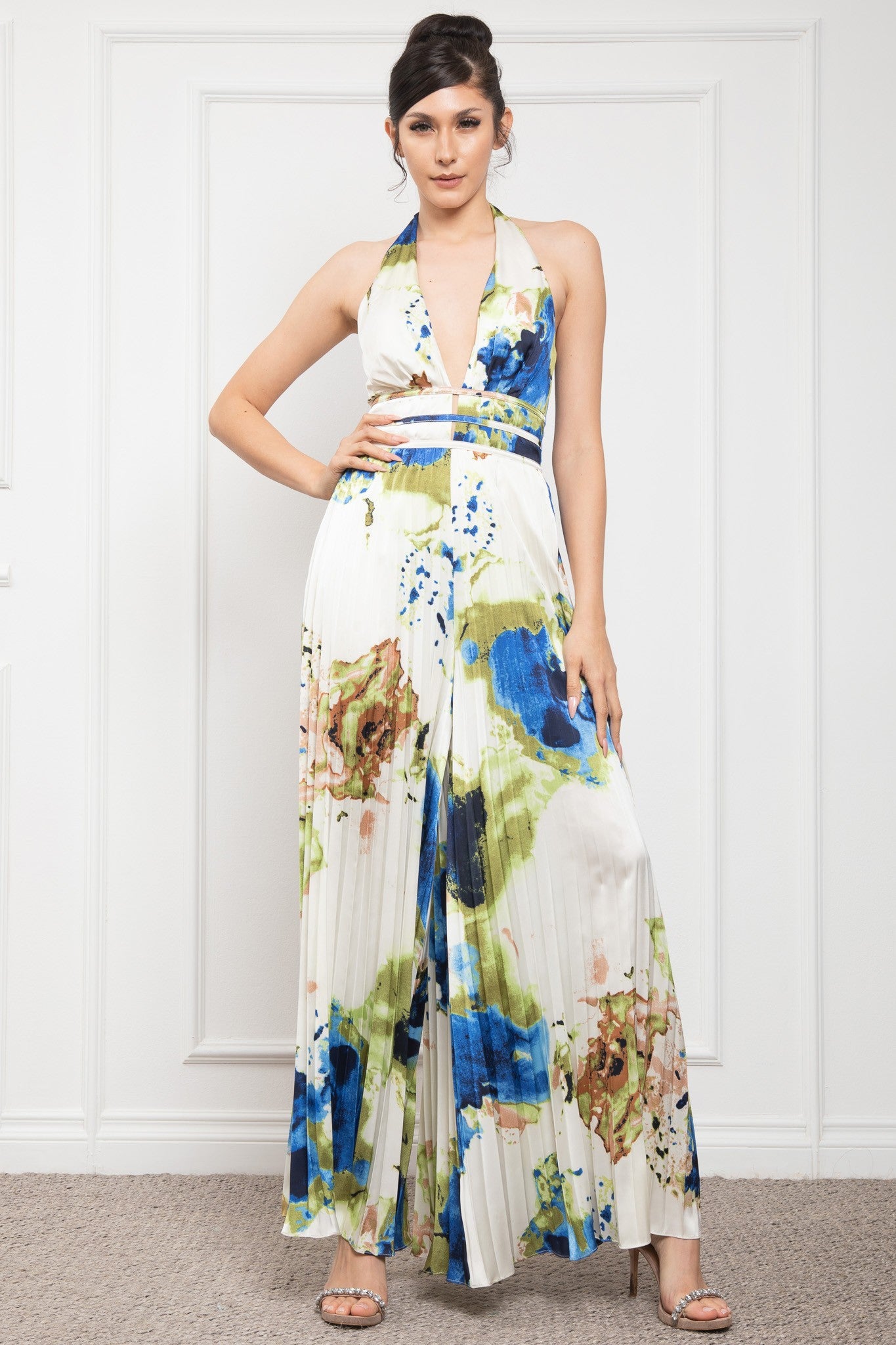 Halter Neck Sleeveless Pleats Bottom Jumpsuit