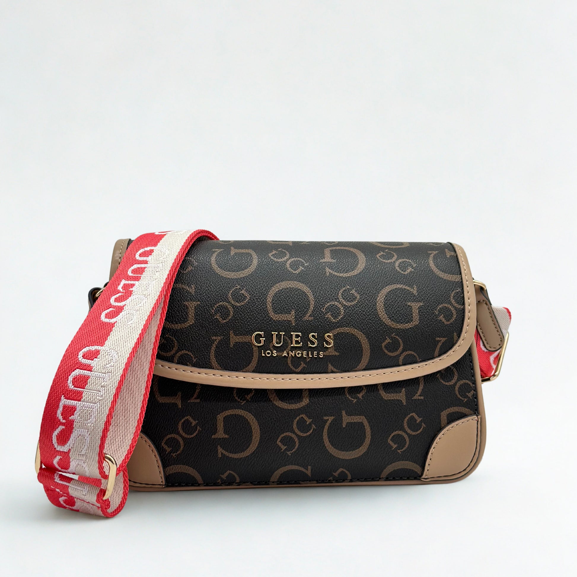 Dale un toque moderno y elegante a tus outfits con esta bolsa original Guess, ideal para quienes aman el estilo urbano con un twist sofisticado. Fabricada en material sintético de alta calidad, esta bolsa cuenta con un diseño monograma en tonos café sobre fondo negro, detalles en beige y una llamativa correa ajustable en color rojo con el logo GUESS en blanco.