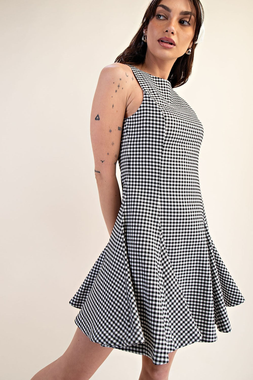 Vestido mini sin mangas con un diseño elegante y moderno, confeccionado en una mezcla de rayón, nailon y spandex que ofrece suavidad, resistencia y elasticidad para un ajuste cómodo. Su falda con paneles godet aporta volumen y movimiento, realzando la silueta de manera femenina y sofisticada.
