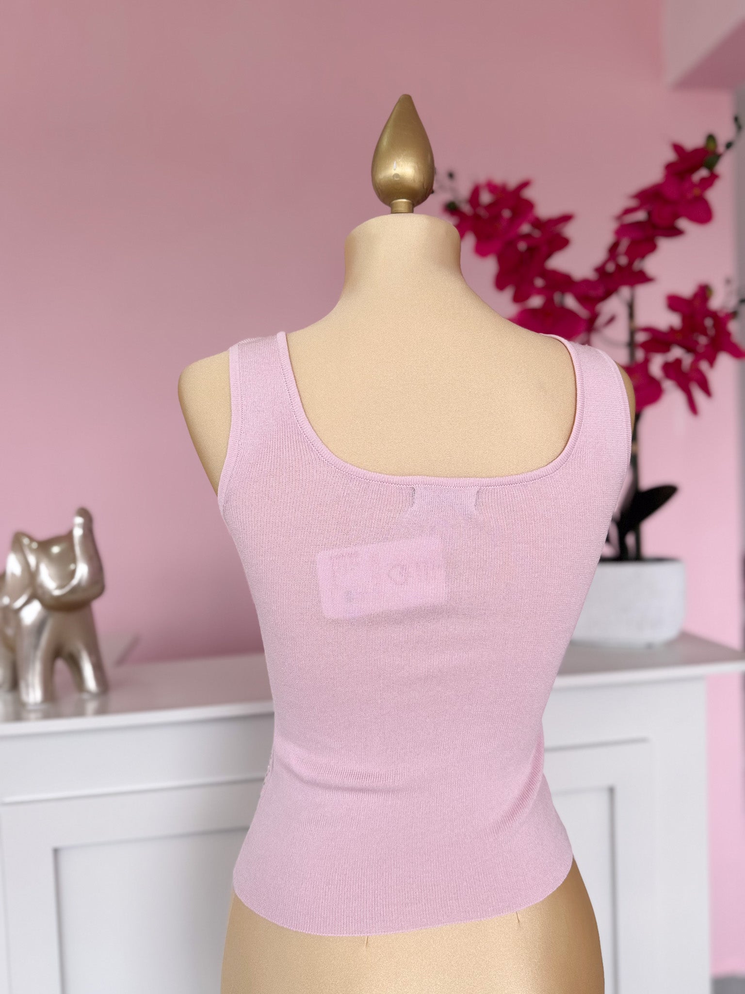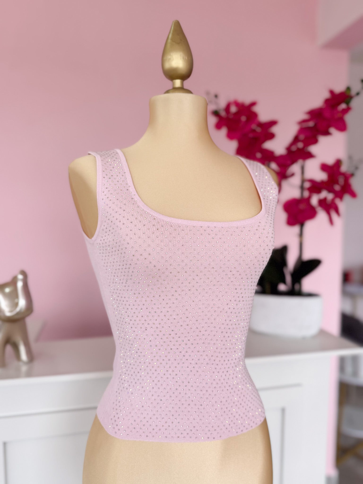 Este top tipo tank es la definición de coquette glam. Su tono rosa pastel y el brillo sutil de las piedritas lo hacen perfecto para destacar con dulzura.