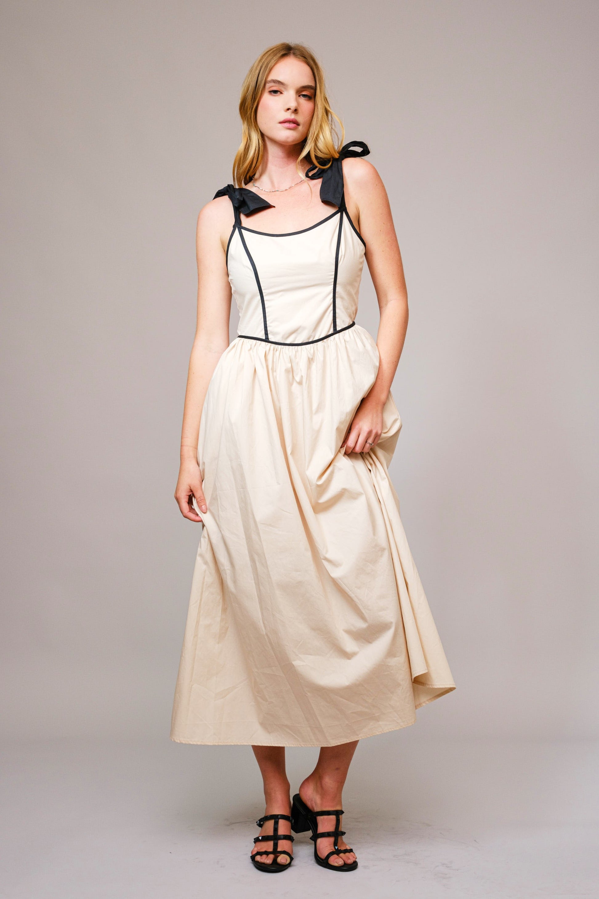 Vestido midi color marfil con detalles en negro. Tirantes con moños grandes, cuerpo entallado con elástico y falda amplia. Estilo romántico y vintage para mujer. Ideal para primavera-verano, sesiones de fotos y outfits de día. Disponible en Meledi con envíos a toda la República.